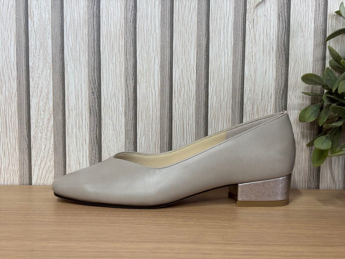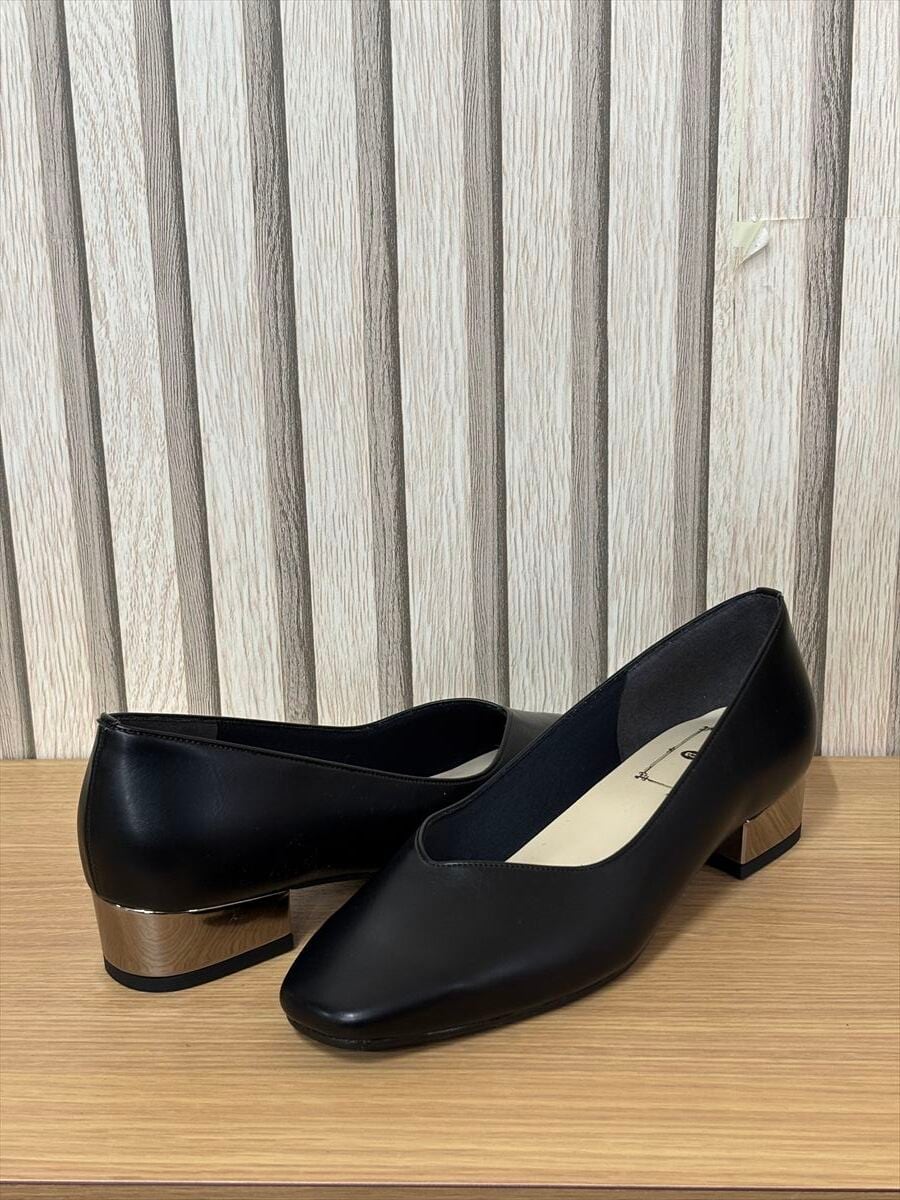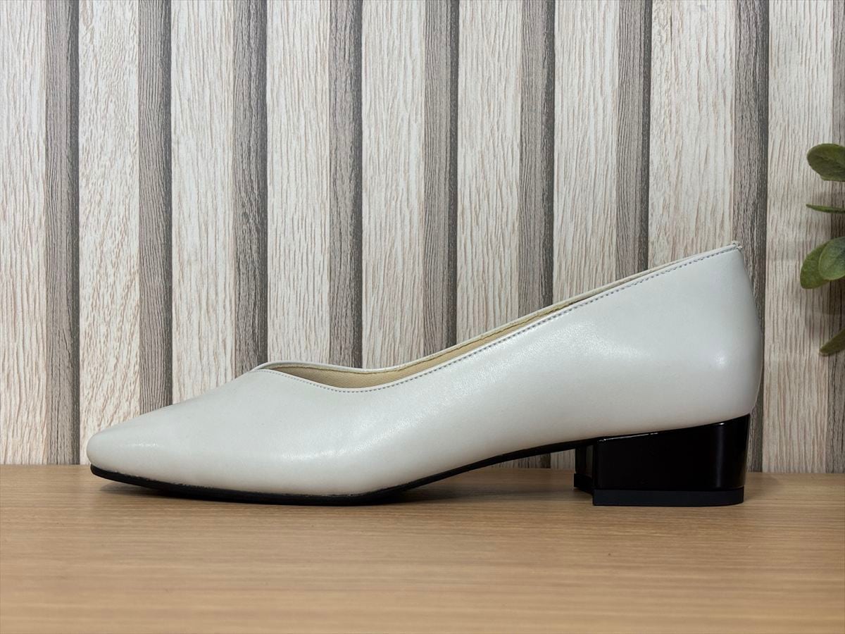 とても足入れの良いスクエアトゥのプレーンパンプス。さりげないVカットデザインと安定感のある3㎝ヒールによるバイカラーの主張が、シンプルながら上品な印象を与えます。どんなスタイルにも合わせやすく、幅広いシーンで活躍する一足です。